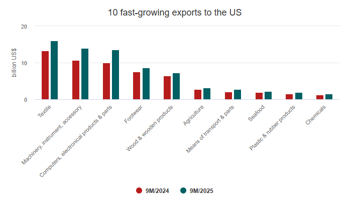 Vietnam exported US$112 billion worth of goods to the U.S. in the first nine months of 2025, up nearly 27% year-on-year despite the recent tariffs and the volatile global economy.