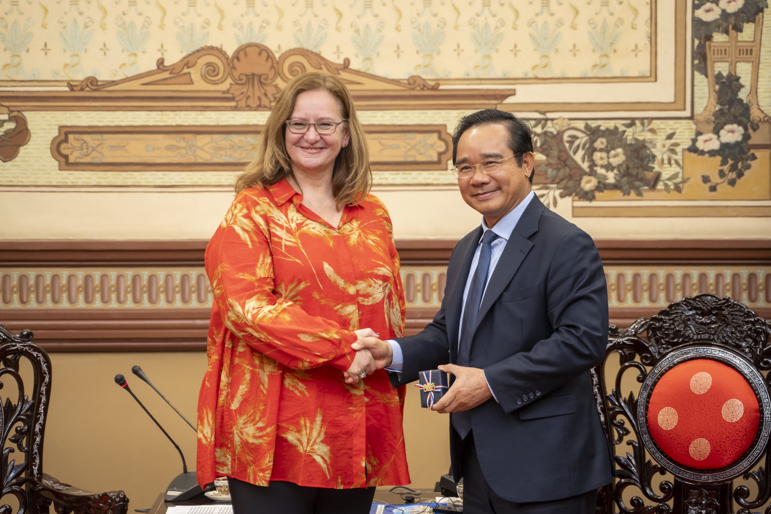 Comrade Nguyễn Văn Được, Member of the Party Central Committee, Deputy Secretary of the City Party Committee, and Chairman of Ho Chi Minh City People’s Committee, shakes hands with Dutch Minister for Foreign Trade and Development Cooperation Aukje de Vries.