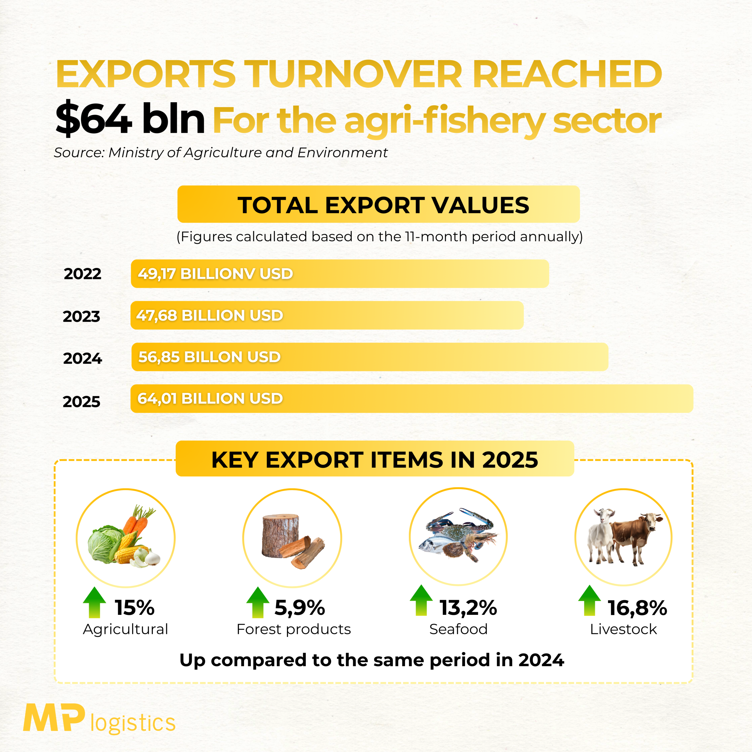 According to data from the Ministry of Agriculture and Environment, total exports of agricultural, forestry, and fishery products reached USD 64.01 billion, demonstrating the sector’s resilience amid global economic uncertainties, supply chain disruptions, and fluctuating commodity prices.