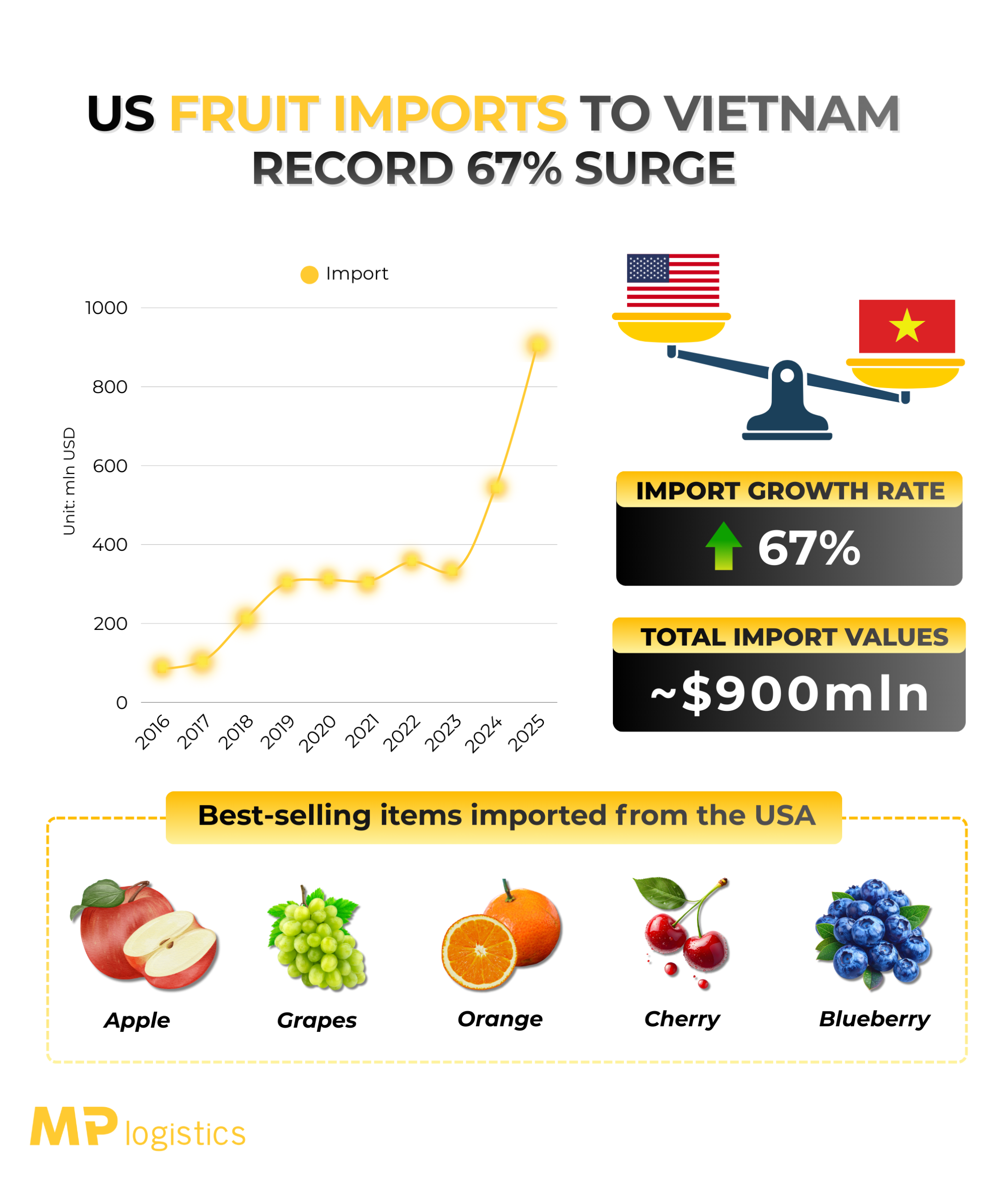 Imports of US fruits and vegetables into Vietnam gained strong momentum in 2025. Total import value increased by nearly 67% year-on-year, exceeding USD 900 million. Over the past decade, imports from the United States have expanded more than tenfold, rising from approximately USD 85 million in 2016 to current levels. This sustained growth confirms the increasing importance of US produce within Vietnam’s import structure.