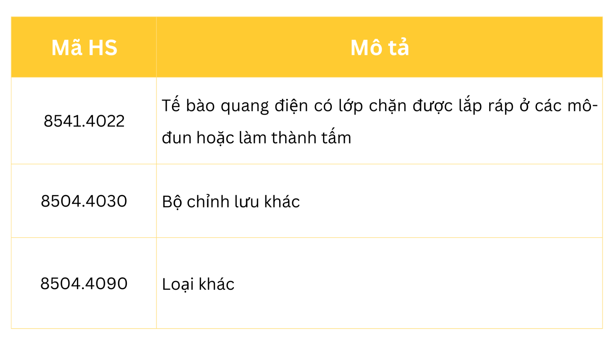 Theo quy định hiện hành, pin năng lượng mặt trời thường thuộc nhóm HS 8541. Phổ biến nhất là mã 8541.4022. Mã này áp dụng cho tế bào quang điện lắp thành mô-đun hoặc tấm.