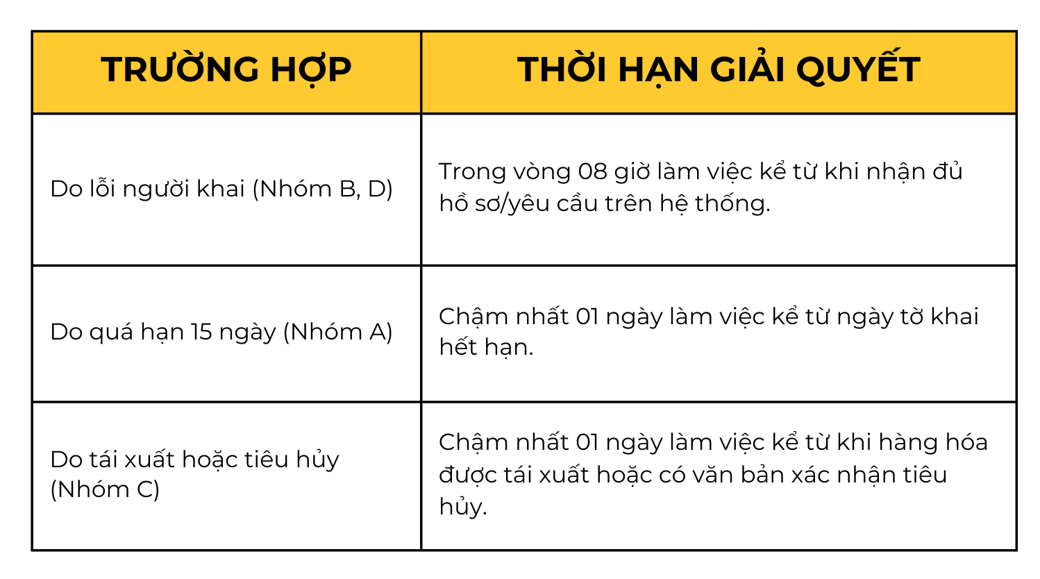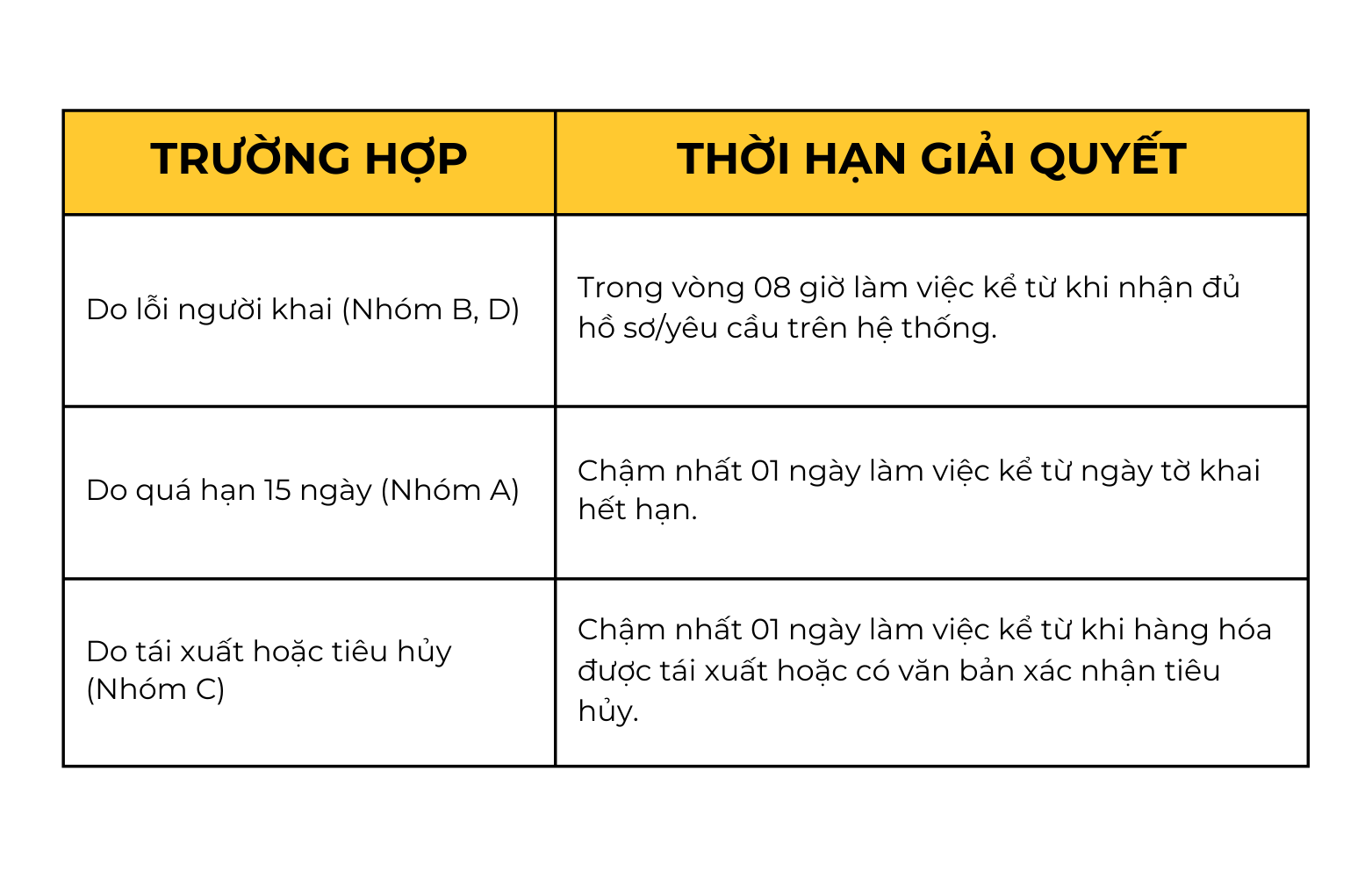 - Nhóm C – Hàng hóa tái xuất hoặc tiêu hủy: Áp dụng khi hàng đã vào khu vực giám sát nhưng phải trả lại khách hàng hoặc bị tiêu hủy theo quyết định của cơ quan thẩm quyền.