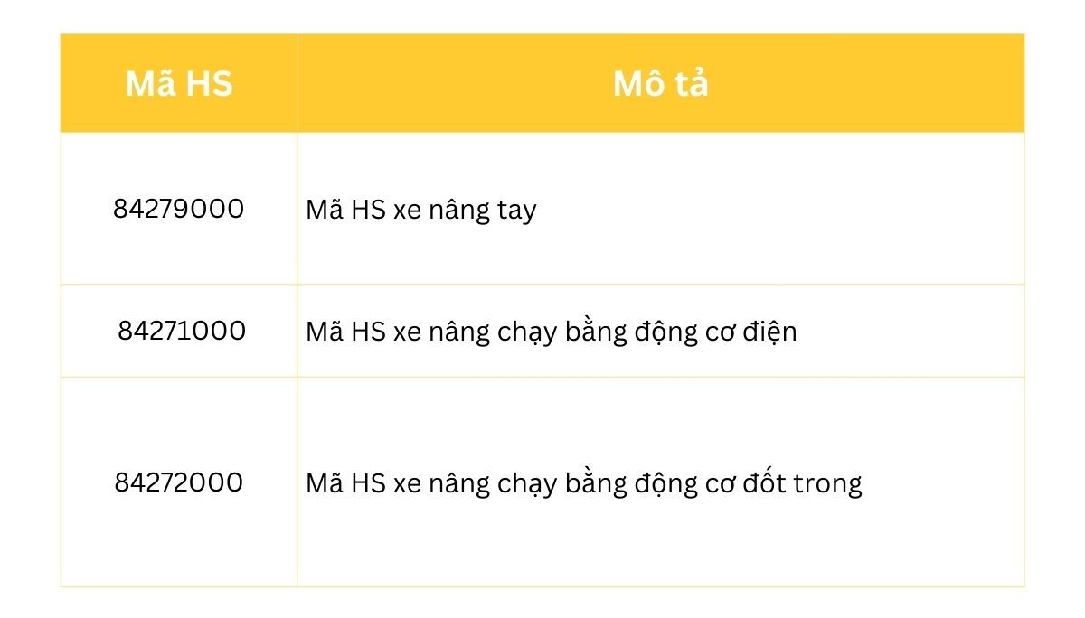 Thông thường, xe nâng được phân loại vào nhóm 8427. Mặc dù vậy, tùy thuộc vào cấu tạo động cơ và công năng cụ thể, mã chi tiết có thể thay đổi. Do đó, doanh nghiệp nên đối chiếu kỹ catalogue và thông số kỹ thuật thực tế trước khi khai báo hải quan để tránh bị áp sai mã.